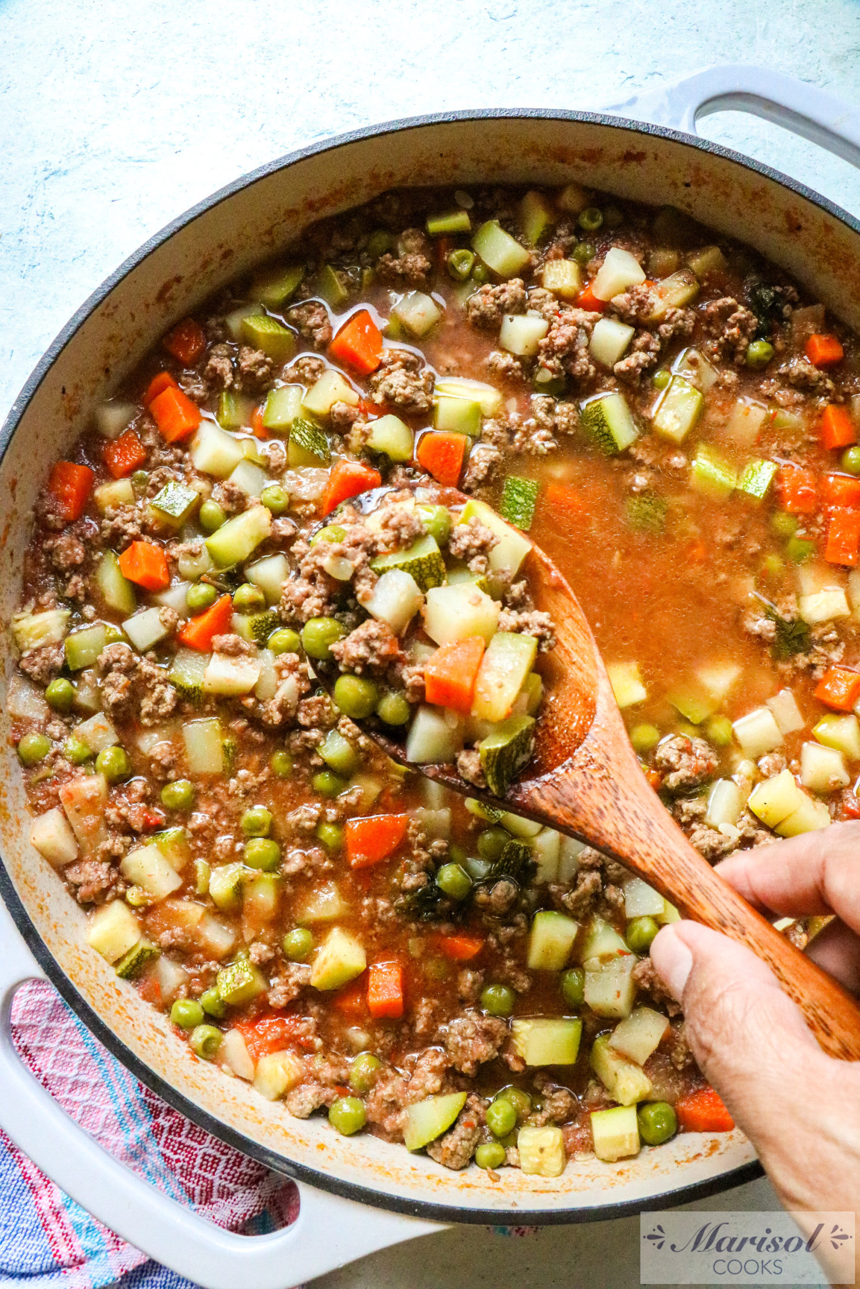 This is a little twist on the traditional picadillo con papas. It has the same homemade “salsa de tomate” base but instead of just potatoes, this picadillo is packed with veggies! These are some of the veggies I had in hand but don’t limit yourself. Celery, corn kernels, green beans, shredded cabbage, mushrooms; they are all great in this dish.